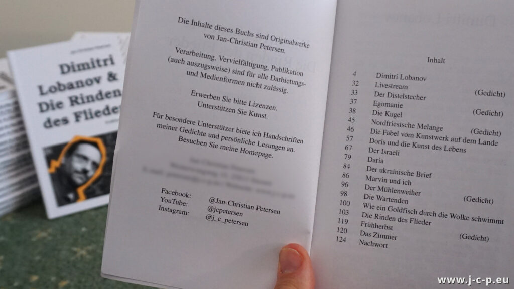Das Taschenbuch beinhaltet viele meiner Lesungstexte, poetische Prosa und Geschichten in schöner Sprache. Es hat 128 Seiten, kostet 12,50 Euro plus 3 Euro Versand und kann per Nachricht an mich oder über das Bestellformular bezogen werden. Klickt auf die Bilder, um die Begleittexte einzusehen. Fragt Lesungen an. Vielen Dank für Eure Unterstützung!
