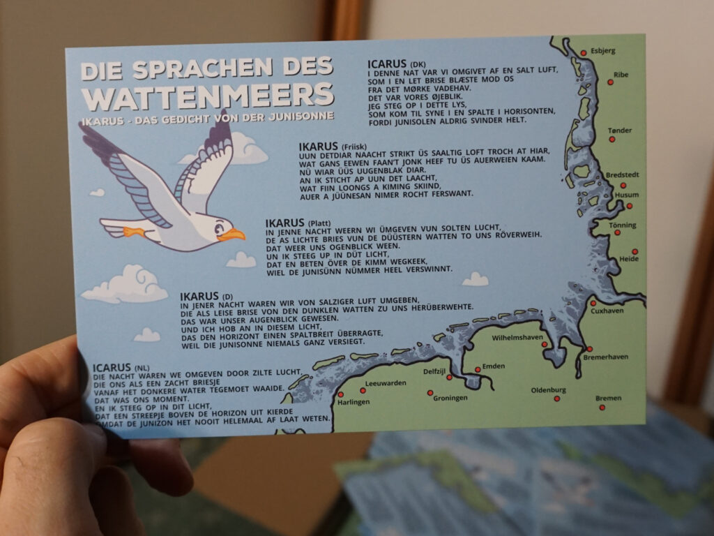 Im April 2025 wurde die neue Karte gedruckt. „Ikarus“ ist nun in alle Sprachen des Wattenmeers übersetzt. Das Wattenmeer ist es auch, das uns verbindet, und die Junisonne, die hier nie untergeht.