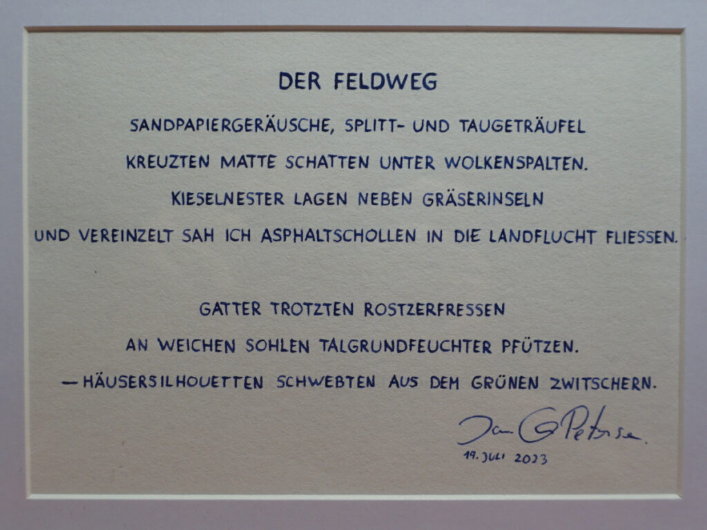 Das originale Prosagedicht (Bild 1) besteht aus neun Segmenten. Ich schrieb es im Rahmen der Künstlerresidenz „Artist in Nature“ in Flensburgs Südstadt zwischen dem 8. und 11. Mai 2025. Die Segmente sind in 9 Einzelrahmen hinter Glas konserviert im Gesamtformat von ca. 65 x 65 cm. Unterstützer meiner Kunst können dieses Unikat erwerben. Hier hören Sie das Gedicht auf YouTube.